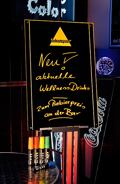 ..daher wurde dieses neonboard auch noch mit gelben led's beleuchtet - je nach farbauswahl erzielt man irre effekte bei der beschriftung